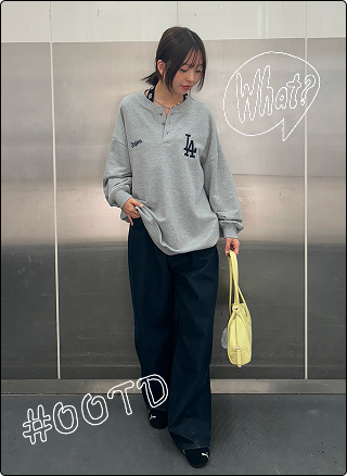 「なんだか垢抜けない…」と感じるときは、トレンドのイエロー×グレー配色がおすすめ。イエローの明るさをグレーがやわらかく抑え、派手になりすぎず自然に印象アップ。さらに、パンツの美しいシルエットが全体を引き締め、シンプルでも洗練された雰囲気に整います!