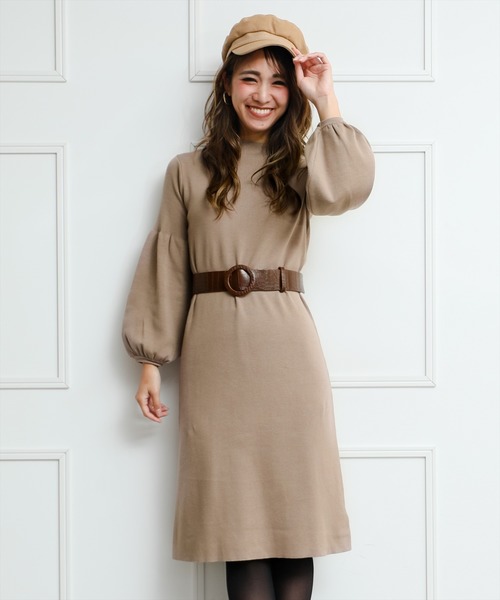 ベルト付きボリュームスリーブニットワンピース
