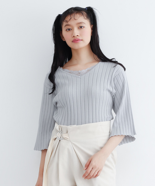 Vネックコットンレースリブニット2720