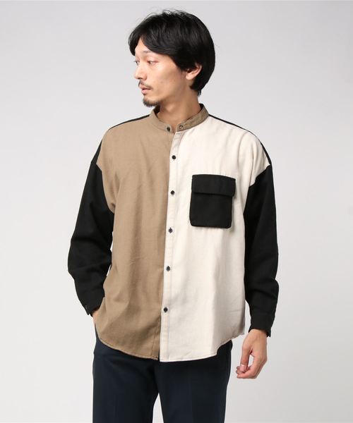 ビッグシルエット 無地 切替え バンドカラー長袖シャツ