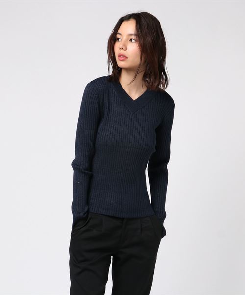 エムエフエディトリアルレディース/m.f.editorial:Women ラメリブVネック長袖プルオーバーニット(グレー・ネイビー・サックスブルー・ピンク)